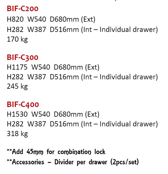 - Locking: 3-Wheel Mechanical Combination Lock @ 1st Top Drawer (Resettable) / Individual keylock (3 keys) for every drawer. / File Separator for every drawer